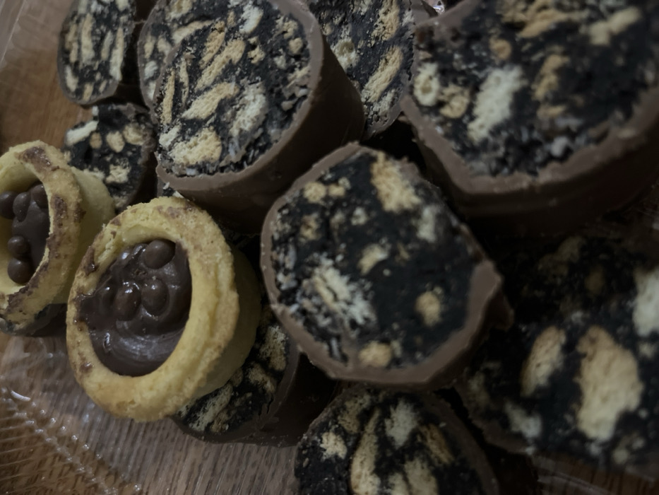 The image displays an assortment of chocolate desserts in a plastic container. Several pieces of chocolate salami, recognizable by their dark filling interspersed with cookie fragments and encased in a thin chocolate shell, dominate the view. Additionally, two round, light-colored pastry shells filled with a smooth chocolate cream, adorned with small chocolate balls, are visible on the left side of the image. The desserts are densely arranged, giving a sense of abundance.