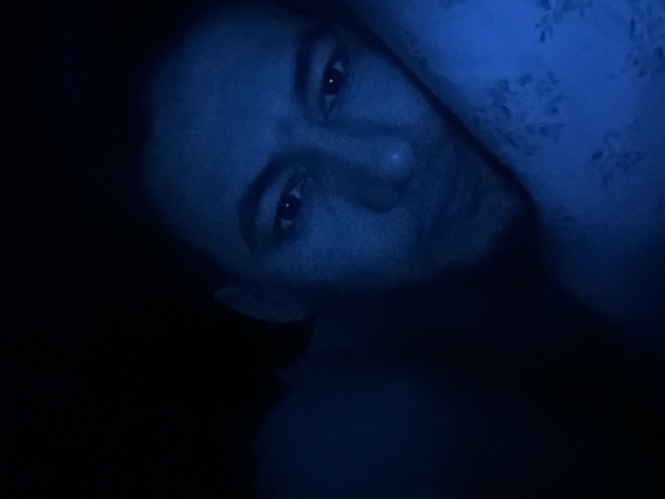 A close-up, low-light portrait of a person with short, dark hair. The image is dominated by a deep blue hue, casting a cool tone across the subject's face, emphasizing the eyes and nose. To the side, a patterned fabric in a lighter shade of blue is visible. The person appears to be lying down. A large portion of the lower half of the frame is dark and undefined.