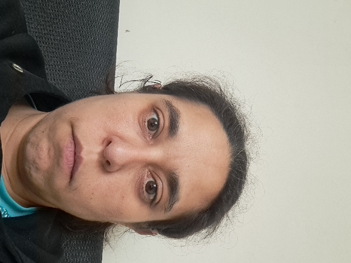An adult individual, appearing female, is depicted in a head-and-shoulders indoor portrait