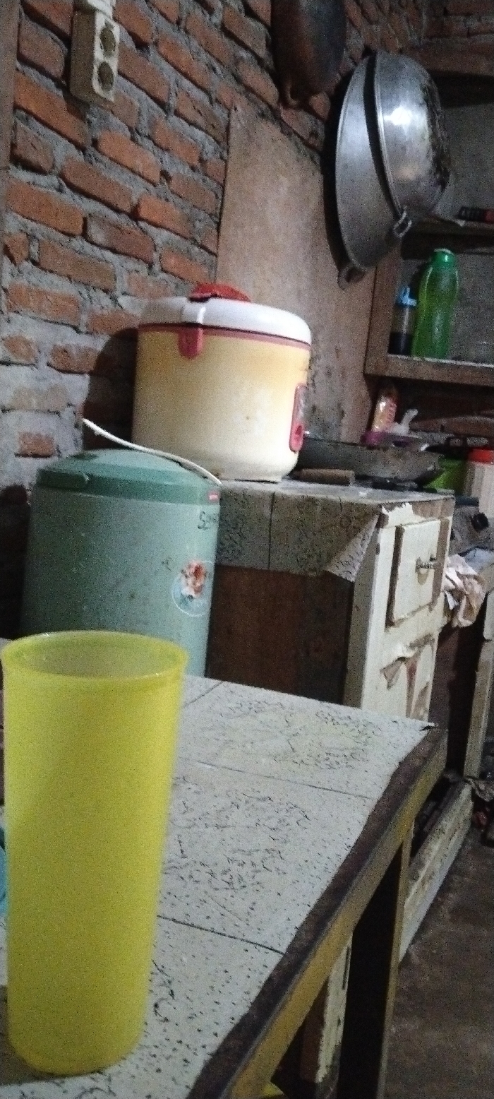 The image depicts an indoor kitchen or utility area in Mns Alue, Indonesia, characterized by utilitarian objects and unfinished construction elements. In the foreground, a plain yellow plastic cup stands upright on a light-colored, possibly patterned, countertop or table. The table edge to its right is dark-colored wood or metal. In the midground, to the left, a teal-colored insulated water dispenser (thermos) with a white plastic ladle resting on its lid is visible, featuring a small, faded floral graphic on its side. Behind and slightly to the right of the water dispenser, an off-white electric rice cooker with a red handle and accents rests on a stone or concrete surface. To the right of the rice cooker, a distressed, light-colored wooden cabinet with a single visible drawer and a cupboard door is present; items, including a dark frying pan, are on top of it. Further right and above, a green plastic bottle and other small items are arranged on a simple wooden shelf. The background on the left features an exposed brick wall with reddish-brown bricks and grey mortar, where a white electrical outlet with two sockets is mounted. On the right background, a dark wooden panel is attached to a light-colored wall, from which two metal pots or pans, one a large wok, are suspended. No individuals are present in the scene.