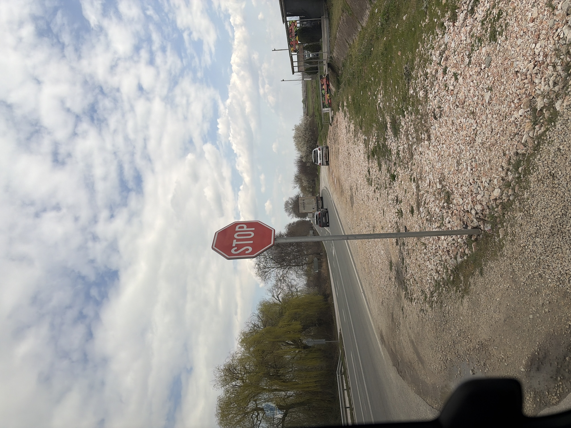 The image depicts a roadside scene in Govedare, Bulgaria, under a partly cloudy sky with prominent white cumulus clouds. In the foreground, slightly to the right of center, a red octagonal STOP sign is mounted on a silver metal pole, indicating a road intersection or merge point not fully visible. An asphalt road curves from the lower-left to the center-right, featuring two visible lanes marked with white lines. On the road, a dark-colored hatchback, possibly a Volkswagen, is moving away from the viewer, followed by a white truck or trailer with "ASTEYS" visible on its side. Another light-colored hatchback, possibly a Peugeot, is parked on the left shoulder of the road further down. To the right of the STOP sign, a white sedan is parked on a gravel shoulder, facing away. Adjacent to this, a small, dark-colored roadside structure or stand with a partial roof is visible, displaying a banner depicting colorful fruits and vegetables. A concrete ditch runs parallel to the road on the right, separating the gravel shoulder from a strip of green grass and uncultivated field. The ground in the immediate foreground and along the road shoulders consists of light-colored gravel and small rocks interspersed with patches of green vegetation. On the left side of the road, a large weeping willow tree with bright green foliage extends over the road. Further back on the left, other deciduous trees with bare branches are present. A metal guardrail parallels the road on the left side, partially obscured by the foreground. The perspective suggests the photograph was taken from inside a vehicle, with a dark, indistinct object partially visible in the lower-left corner of the frame.