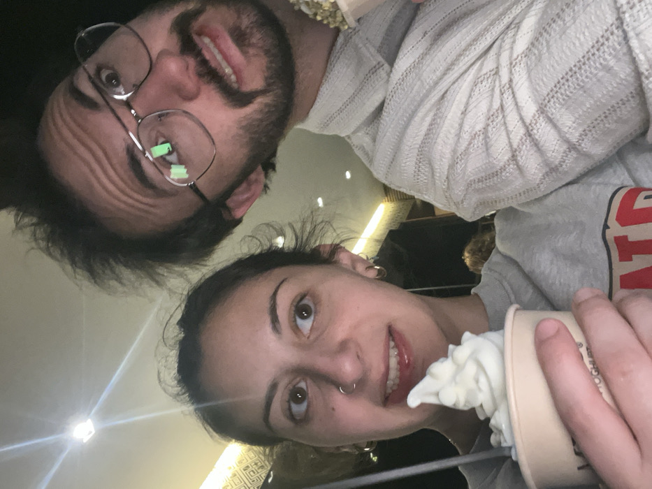 A selfie of a couple holding desserts. A man with dark hair and glasses is on the top left, smiling with his teeth slightly visible. A woman with a nose ring is at the bottom right, also smiling, holding a cup of what appears to be soft-serve ice cream. Both individuals are fair-skinned. The background is somewhat blurry but shows an interior with a light fixture visible. The woman is wearing a grey sweater, while the man wears a light-colored, textured sweater.