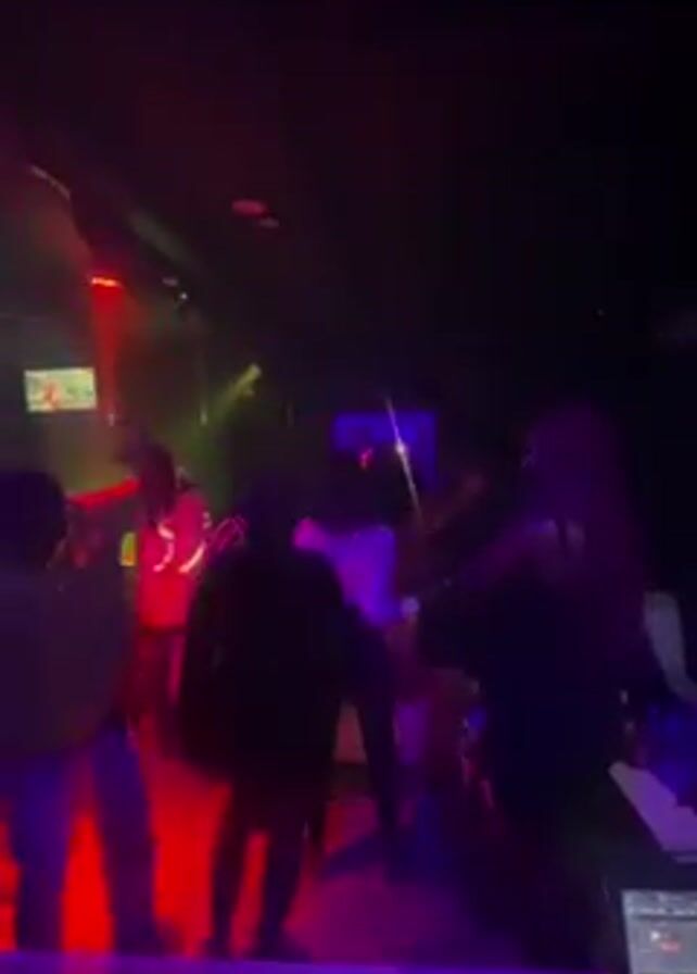 nightclub scene with people dancing under colorful lights. There is a DJ booth visible in the foreground with equipment. People are dressed casually and seem to be enjoying themselves. The club has a dark interior with lighting that emphasizes pink, purple, and green hues.