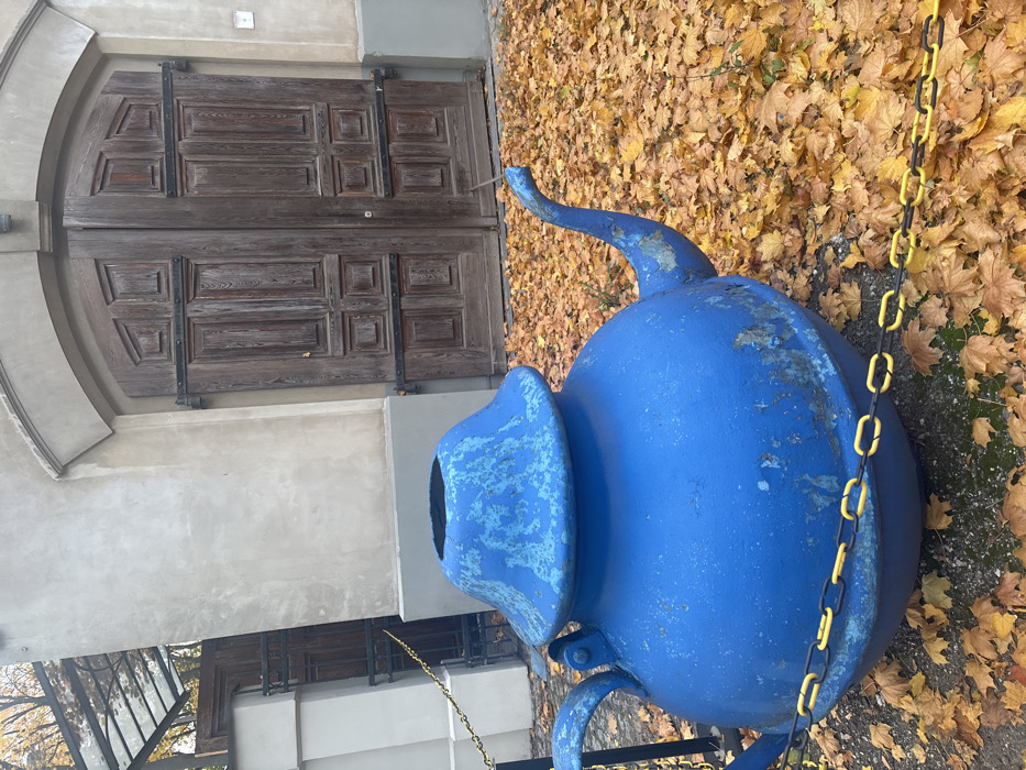 - "An outdoor, autumnal scene in the courtyard of the Museum of the City of Łódź (Muzeum Miasta Łodzi) at Ogrodowa 15, Łódź, Poland, features a large, weathered blue teapot sculpture" by FM-Cr3ZF2, licensed under CC BY 4.0