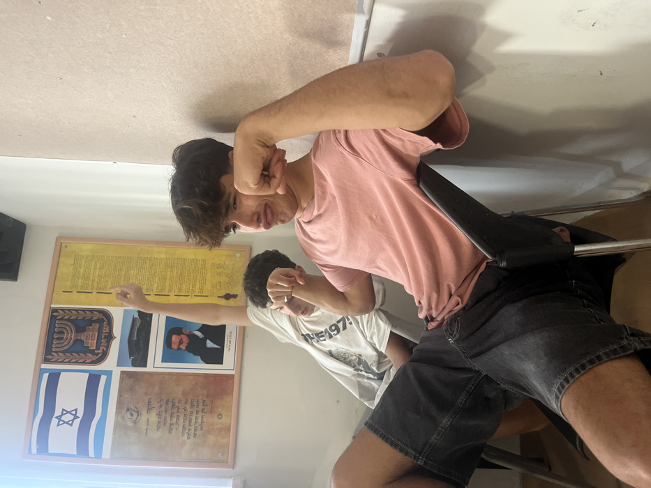 Two young males are depicted in an indoor setting, likely a classroom or educational facility, in Tel Aviv, Israel