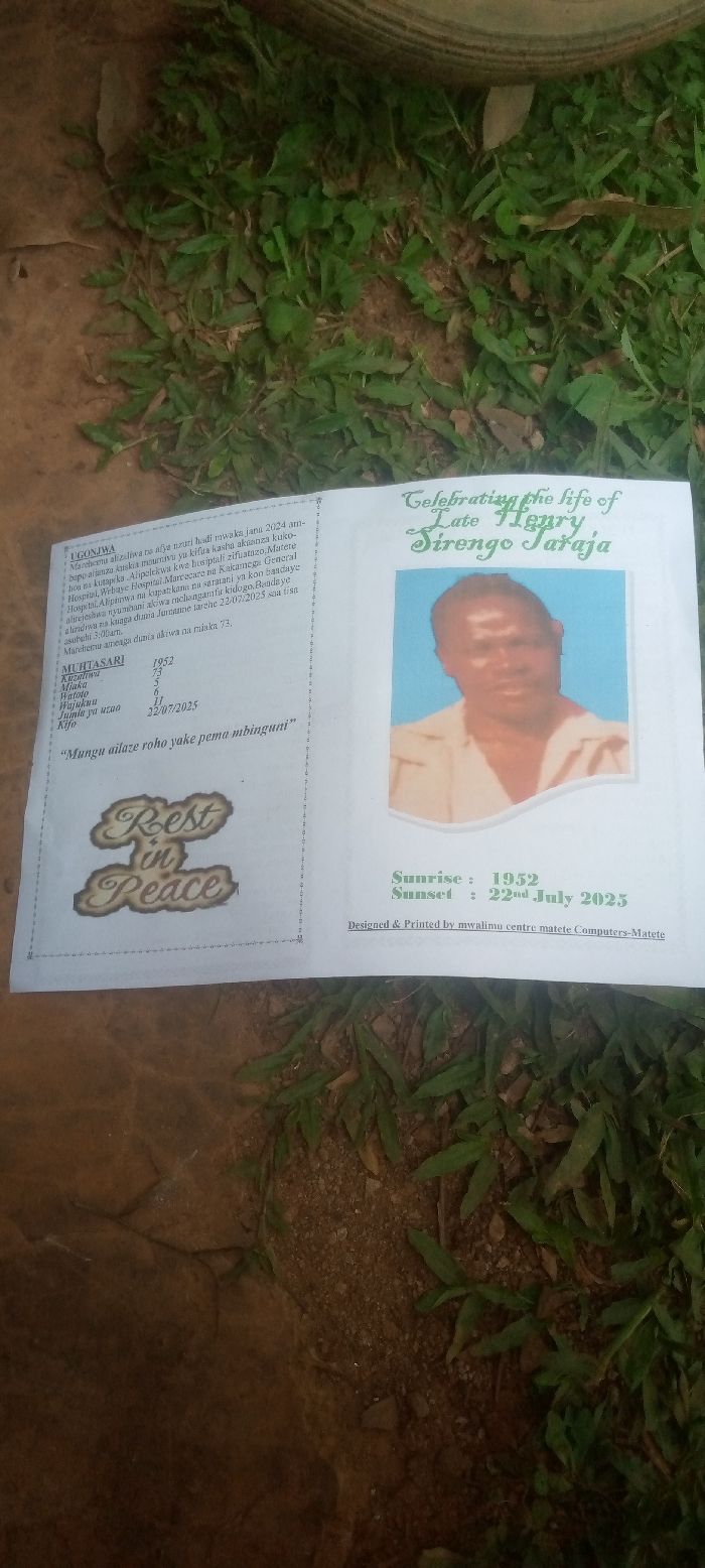 A white, bi-fold funeral program for the late Henry Sirengo Taraja is positioned on an uneven surface of reddish-brown soil interspersed with patches of sparse green grass