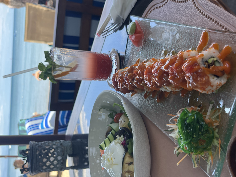 An overhead shot displays a meal featuring sushi, a salad, and a beverage. The sushi, arranged in a row, is coated with orange sauce and sprinkled with roe. The salad contains greens, mozzarella, tomatoes, cucumbers, and grilled eggplant in a large bowl. A cocktail glass contains a layered drink with a straw and mint garnish. Seaweed salad is also on the table. The scene is set outdoors, with a sea view and partially visible furniture in the background.