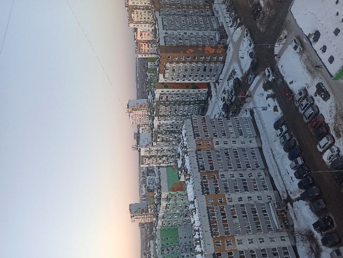 The image displays a high-angle panoramic view of a residential area in Кондратово, Russia. The scene is illuminated by the soft light of twilight, with a clear sky transitioning from light blue overhead to a faint orange near the horizon. The landscape is dominated by numerous multi-story apartment buildings, exhibiting diverse architectural styles and color schemes, including grey with brown and orange accents, light green, and white facades with geometric patterns. Snow uniformly covers the rooftops of buildings, unpaved ground areas, and a substantial number of parked vehicles. Streets and extensive parking lots are densely populated with parked automobiles, primarily passenger cars of various colors. Several vehicles are actively in transit on the roadways. A few indistinct human figures are discernible at ground level, engaged in pedestrian movement. Faint overhead communication or power lines traverse the upper portion of the sky.