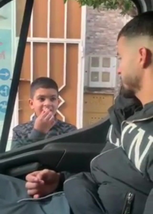 A boy is looking in the window of a car while speaking to a man sitting inside. The boy is light-skinned with short black hair. He is wearing a grey and black patterned shirt. The man is also light-skinned with a short, dark beard and a buzz cut. He is wearing a black jacket and grey pants. The inside of the car is dark, and the boy is standing on the street outside. Behind the boy, there is a sign with arrows and bicycle symbols. The street is lined with brick buildings. The boy is talking and gesturing while the man looks at him and listens.