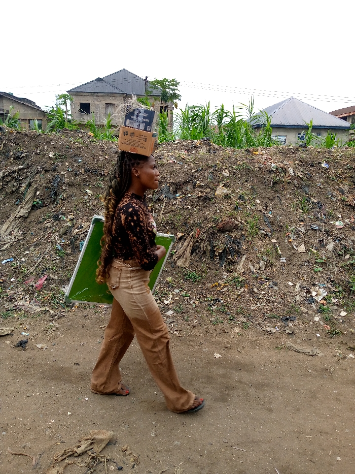 An adult female is depicted walking outdoors in Aba, Nigeria, viewed from a profile perspective, facing right. She carries two stacked cardboard boxes on her head and a large, rectangular object with a bright green surface and a silver frame in her left arm. She wears a dark, patterned long-sleeved shirt, brown-tan wide-leg trousers, and flat sandals, with red nail polish visible on her right foot. Her long, dark braided hair, which has lighter sections, extends down her back. The ground consists of a dirt path with scattered debris in the foreground. To the subject's left, a substantial mound of earth mixed with refuse, including plastic and organic waste, is present. In the background, sparse green vegetation and two concrete buildings with dark, pitched roofs are visible under an overcast sky. Faint overhead power lines are discernible in the upper background.