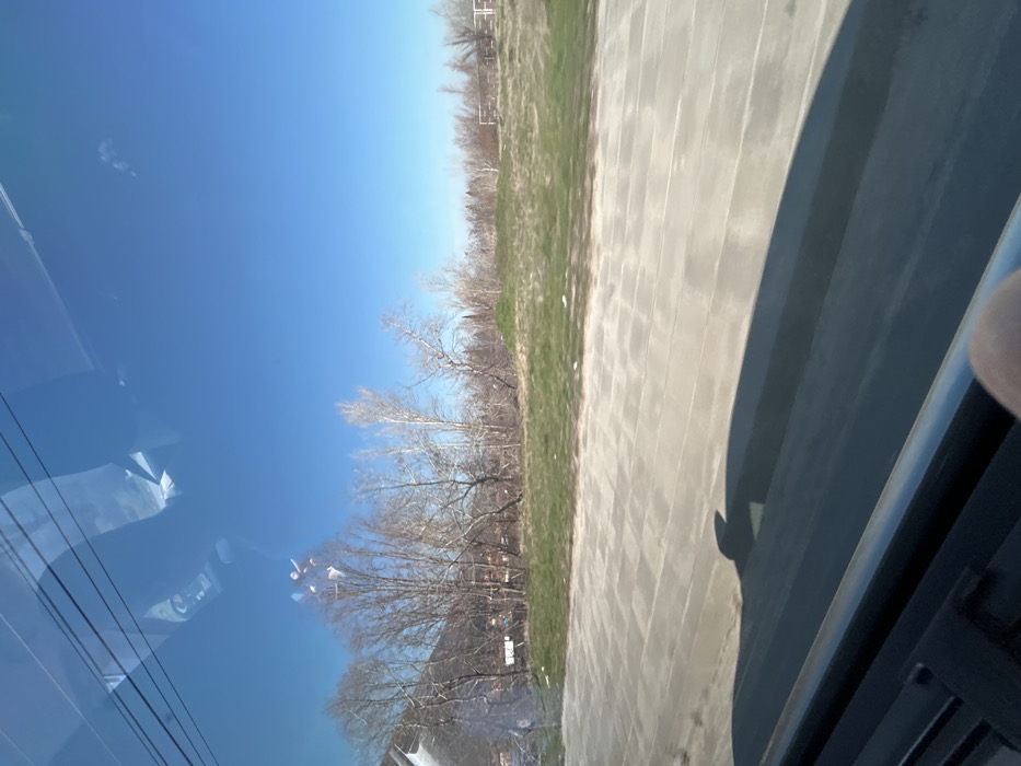The image captures an outdoor scene in Vetren Dol, Bulgaria, viewed from inside a vehicle. The upper half of the frame displays a clear, vibrant blue sky. Significant reflections are present in the sky area, revealing distorted elements of the vehicle's interior, including angular shapes, dark lines resembling overhead cables or power lines, and faint, partial reflections of a human face or head. The middle ground features a stretch of uneven ground covered with grass and patches of bare earth, exhibiting varying shades of green and brown. A prominent line of deciduous trees, largely bare of foliage, extends horizontally across this section, suggesting late winter or early spring. Behind the trees on the left, architectural elements consistent with residential buildings, including light-colored walls and reddish roofs, are visible. A white sign with dark text is partially visible near the tree line on the left. On the far right, a light-colored fence or railing structure is present. The lower portion of the image shows a grey, paved surface, likely concrete, characterized by a pattern of distinct horizontal lines. A dark, elongated shadow, consistent with the vehicle from which the image was captured, is cast onto this paved area. The extreme bottom edge of the frame reveals a dark, interior component of the vehicle, possibly a dashboard or window sill, and the tip of a human finger. No other individuals or explicit actions are observed in the outdoor scene.