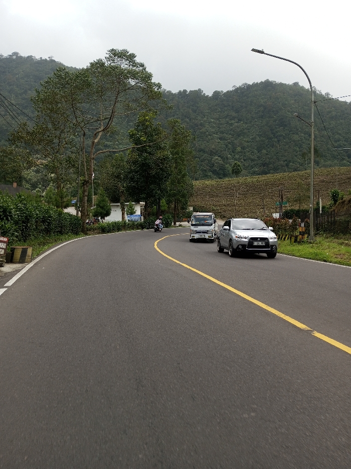 The image depicts a winding asphalt road through a mountainous, vegetated landscape