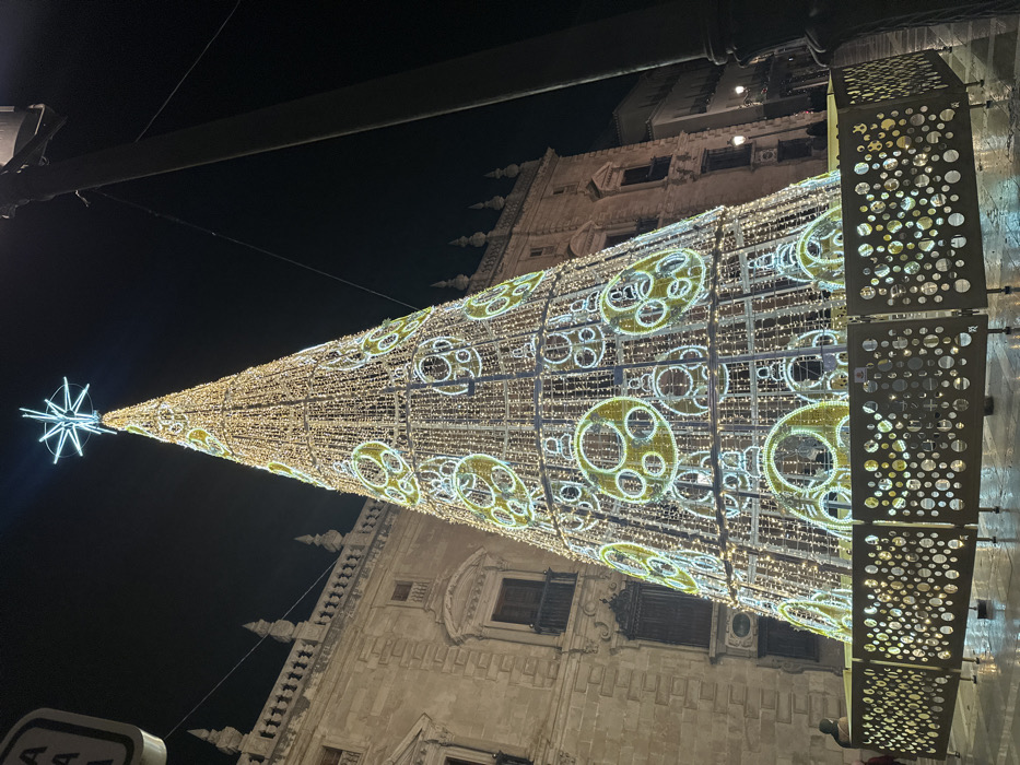 A large, illuminated Christmas tree constructed with metal framing and strings of lights stands tall against a night sky. The tree is adorned with circular light patterns. A bright star sits atop the tree. An ornate building with windows and architectural details is visible in the background, adding to the festive and urban setting. A metal structure with circular cutouts appears on the right side of the image.