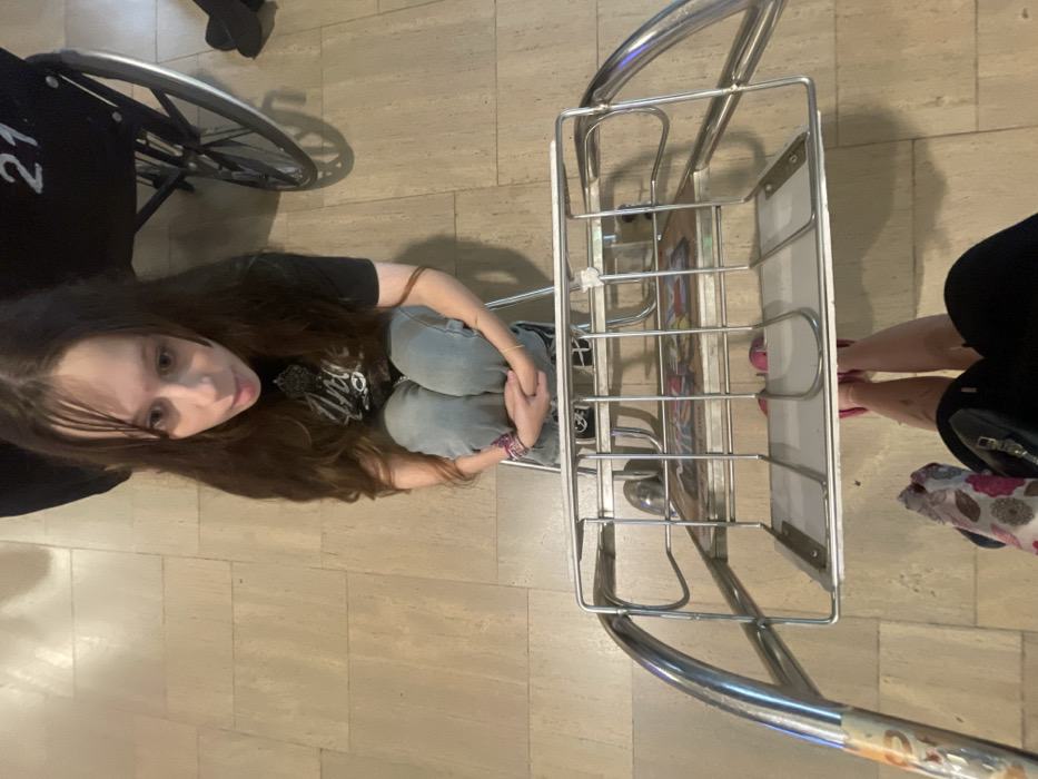 An overhead, wide-angle shot captures a scene at an airport in Israel. A young female, with long brown hair and bangs, is positioned centrally, squatting or sitting on a low stool. She wears a black graphic t-shirt, light blue jeans, and dark sneakers, with her arms wrapped around her knees. A colorful bracelet is on her left wrist, and a thin bracelet on her right. She gazes upwards towards the camera with her mouth slightly open. Directly in the foreground, partially obscuring the lower half of the girl, is a chrome-plated metal luggage cart with a flat bottom and basket-like upper shelf. The pink-shoed feet and lower legs of the person holding the camera are visible behind the cart, along with a portion of a patterned garment and a dark bag. In the background to the right of the girl, a black wheelchair with the white number "21" on its backrest is partially visible. The floor is covered with light-colored square tiles.