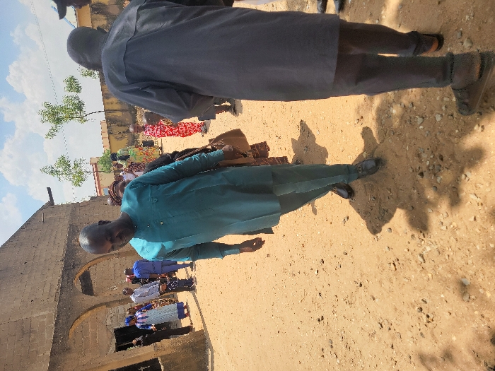 The image captures an outdoor scene in Suleja, Nigeria, under a bright, clear sky with scattered white clouds. The ground is unpaved, consisting of light brown, dusty soil mixed with small stones. In the immediate foreground, a man with a closely shaven head and light brown skin is depicted walking towards the viewer's left. He wears a teal-colored, long-sleeved tunic and matching trousers, complemented by dark formal shoes. His gaze is directed downwards, and he carries a brown bag or satchel in his right hand. A distinct shadow from this individual is cast on the ground to his right. To his right and slightly behind, another person, observed from the back, walks away, dressed in a dark grey or black long tunic and trousers. In the mid-ground, a group of approximately eight to ten individuals, comprising both adults and children, are gathered near a single-story building on the left. This building, constructed from unpainted light brown concrete blocks or similar rough material, features at least two prominent arched doorways or openings. The individuals in this group wear varied attire, including light blue patterned dresses, dark clothing, a blue shirt, and a child in a red and white patterned outfit. Further in the background, a light-colored wall is visible, with a small portion of a blue roof extending above it. Two slender trees with sparse green foliage are also present in the background. The overall scene depicts communal movement or gathering in what appears to be a residential or public area of a semi-urban environment.
