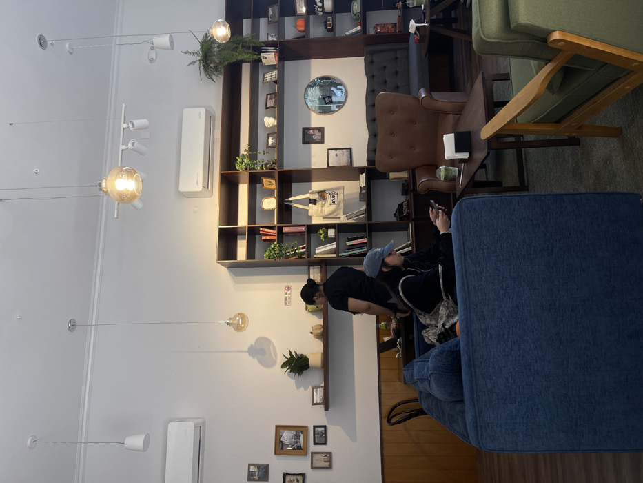 The image captures the interior of a café or lounge located in Zibatá, Mexico. The space features white walls, dark wood-patterned flooring, and a grey area rug. Overhead, the white ceiling is fitted with various pendant lights, including white conical and amber spherical shades, alongside white track lighting. Two white split-unit air conditioners are mounted high on the walls. A young individual, wearing a blue baseball cap and a dark jacket, is seated on a blue fabric sofa in the foreground, engrossed in a smartphone held in both hands. A light-colored bag is positioned next to them on the sofa. In the midground, a second individual, with dark hair pulled back and wearing a dark short-sleeved top, stands facing towards the left, appearing to be attending to a surface or counter. A "NO SMOKING" sign is visible on the white wall near this person. The left wall features wooden wainscoting below a white section adorned with multiple framed photographs of varying sizes. A wooden shelf on this wall displays a potted plant and a light-colored decorative pumpkin. The right side of the scene is dominated by a large, dark brown wooden bookshelf unit, meticulously arranged with books, potted plants, small sculptures, framed pictures, a vintage radio, and a green rotary telephone. A white canvas tote bag with "D'LU" printed on it hangs from one shelf. A circular mirror, reflecting an "OPEN" sign, is integrated into the shelving unit. Seating options include a brown leather armchair and a dark grey tufted sofa situated against the bookshelf. A small wooden coffee table, holding a napkin dispenser and a clear plastic cup containing a green beverage, is placed in front of the brown armchair. A green armchair with wooden arms is partially visible in the lower right corner.