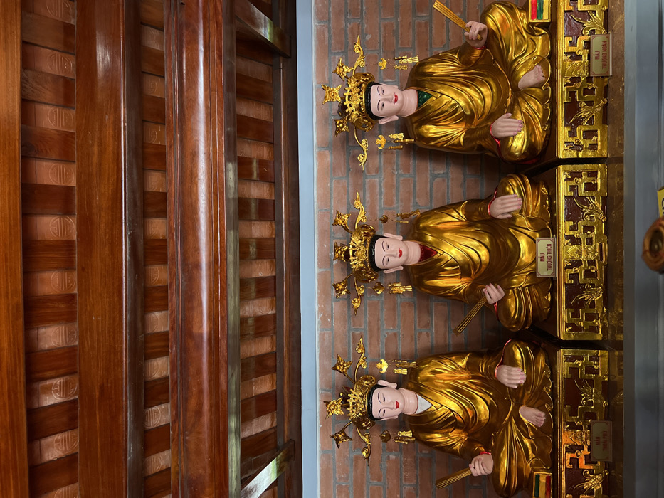 Three gilded statues of seated figures wearing ornate crowns are displayed against a brick wall. Each figure holds a fan. The statues rest on golden platforms with labels inscribed in Vietnamese. Wooden beams are visible on the left side of the frame. The statues appear to be part of a religious or cultural display.