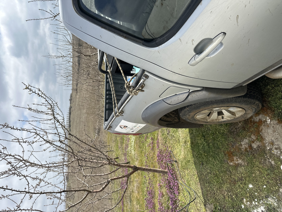 The scene is set in an agricultural area within Studena, Bulgaria, specifically an orchard. A silver-colored, four-door pickup truck, likely a utility vehicle, occupies the right side of the frame, facing generally forward and slightly to the left. The truck's passenger side is visible, exhibiting dirt and minor wear on its body panels, fender flare, and alloy wheel. A dark-colored bed liner in the truck bed is secured with a light-colored bungee cord cargo net, which contains a blue object partially visible underneath. A black roll bar is mounted behind the truck's cab. A white rectangular sticker with a black logo, depicting a figure and non-English text, is affixed to the truck's rear quarter panel. The environment consists of rows of deciduous trees with bare branches, suggesting late winter or early spring conditions, stretching into the background. The ground beneath the trees is covered with green grass, interspersed with patches of purple and white flowering ground cover. A black cable or hose runs along the ground in the lower-left quadrant of the image. In the distance, a barren hill with a faint treeline at its crest is visible under a sky that is partly cloudy with patches of brighter light. No individuals or explicit actions are observed.