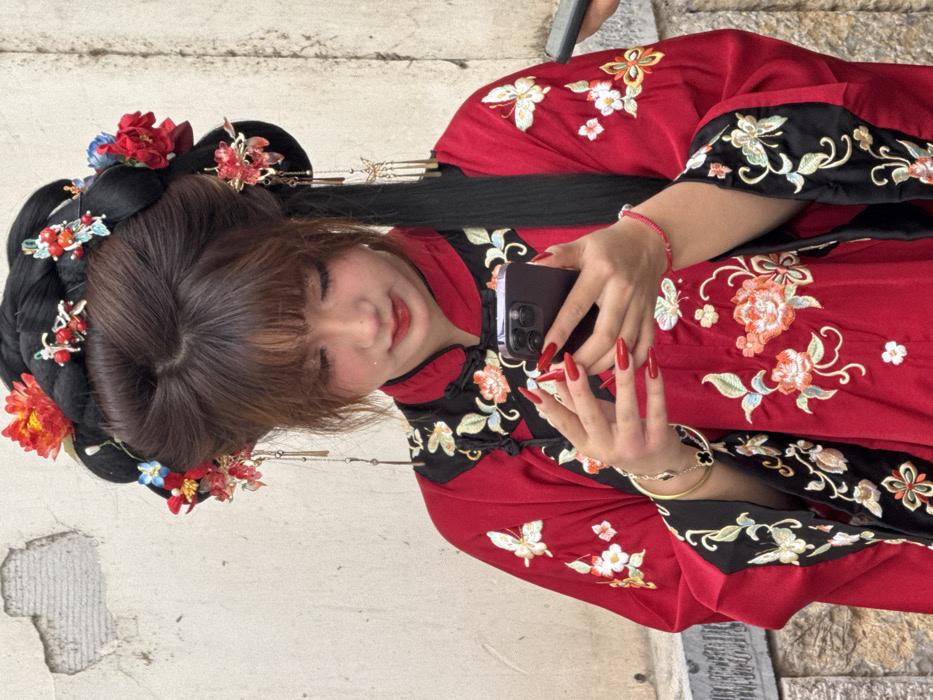 A young person, identified as female, stands in Qinhuai District, China, against a textured, light-colored wall with minor surface imperfections. She wears a red traditional Chinese garment featuring a black collar with frog closures and black borders adorned with elaborate multicolored embroidery of butterflies and floral patterns. Her dark hair is styled into a large, intricate updo, embellished with red, orange, and blue floral ornaments, red berry-like clusters, gold-colored metal hairpins, and multiple dangling chains with tassels. Her fingernails are long, pointed, and painted bright red. She holds a dark-colored smartphone with a prominent camera module in both hands, gazing downwards at its screen. A gold-colored bracelet with a black clover charm is visible on her left wrist, and a red braided bracelet is on her right. A hand holding another dark-colored smartphone is partially visible on the far right of the frame.