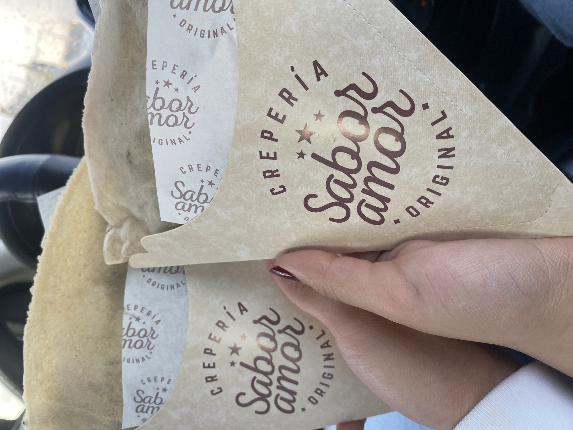 A close-up shot shows a person's hand holding two triangular paper containers. Each container is printed with the branding "CREPERÍA Sabor amor ORIGINAL." One container is predominantly light brown with dark brown lettering, while the other has lighter lettering on off-white paper. The containers presumably hold crepes, as suggested by the branding. The background includes a glimpse of what appears to be a car interior, specifically the steering wheel and dashboard. The setting might be inside a vehicle, although the location in the city of Santa Clara Ocoyucan, Mexico, is not directly discernible from the image.