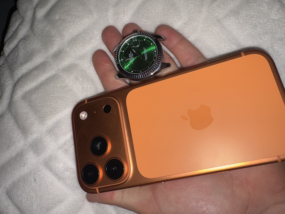 A light-skinned human hand holds an orange-colored smartphone and a green-dialed watch head. The smartphone, an iPhone identifiable by its back Apple logo and a three-lens camera array with a flash module on the upper left, features a custom metallic orange finish with a slightly darker bronze hue around the camera housing. The device is held vertically, partially obscuring the thumb and fingers of the hand. Resting on the palm, partially beneath the phone, is a Rolex Oyster Perpetual Datejust watch head, characterized by its fluted silver-tone bezel and a vibrant green dial with "SUPERLATIVE CHRONOMETER OFFICIALLY CERTIFIED" inscription, a Rolex crown logo, and gold-colored second hand. The background consists of a white, soft, textured fabric, resembling a blanket or towel. No identifiable geographical markers within the image indicate a specific location in Sofia, Bulgaria.