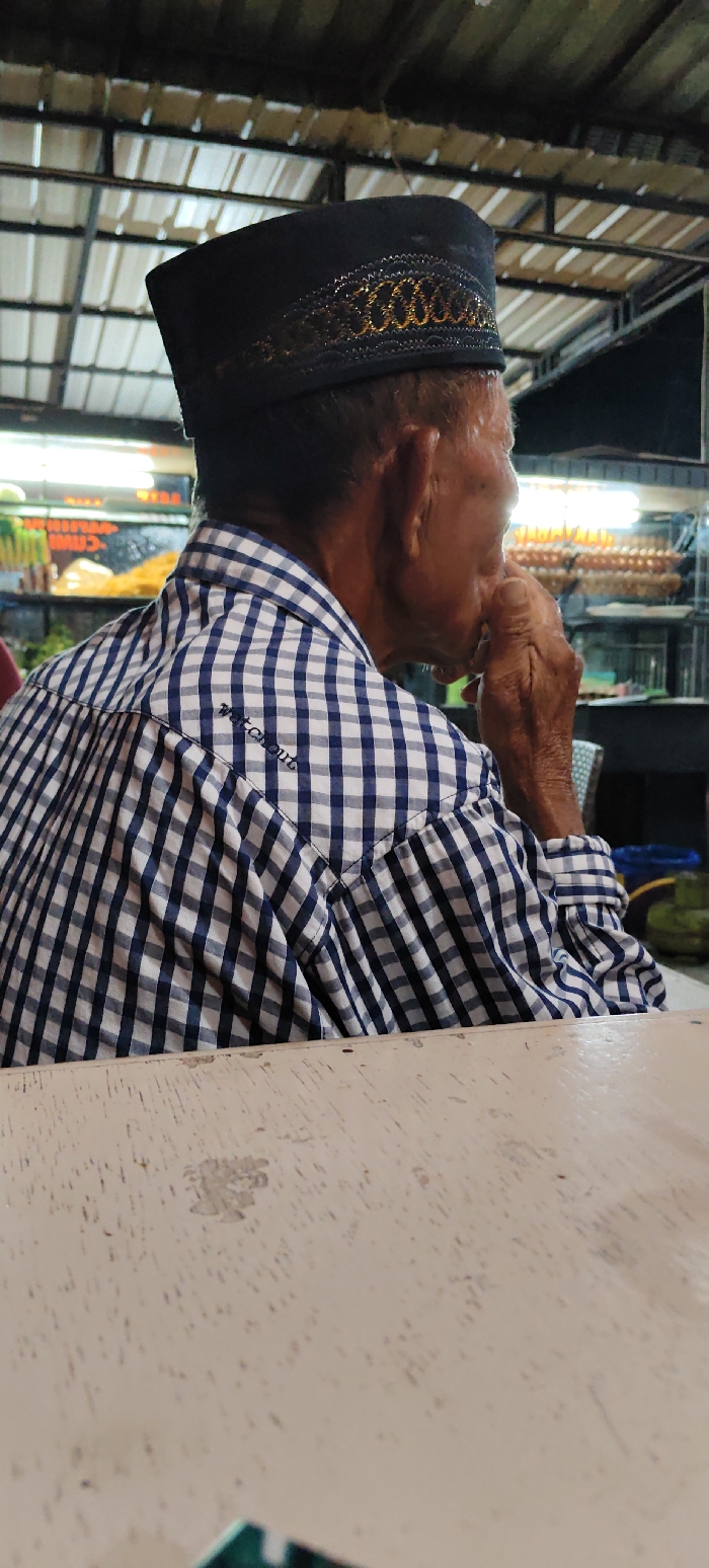An older individual, viewed from the back and right profile, is seated at a light-colored, textured table in a food stall or market setting in Cut, Indonesia