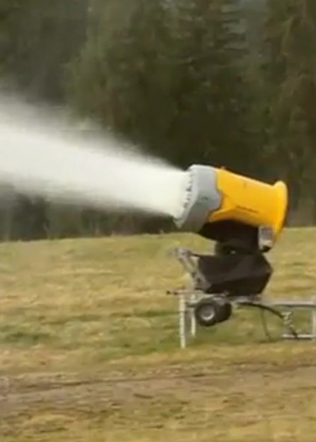 yellow snow cannon in a grassy field. The cannon is pointed towards the left side of the frame and is actively spraying a mist of water into the air. Behind the cannon are several tall evergreen trees and a mountain range can be seen in the distance. The sky is overcast. The ground around the cannon is a mix of grass and muddy patches. The snow cannon is labeled "TT10". There is background sound of someone speaking.