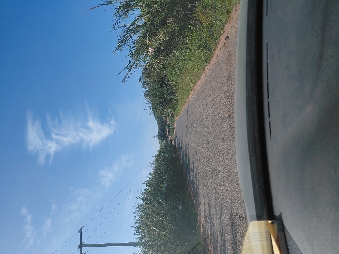 The image depicts a rural or semi-rural road scene in Sidi Moussa Ben Ali, Morocco, viewed from inside a vehicle under clear daylight conditions. The bottom portion of the frame displays a dark-colored dashboard, featuring a curved windshield base and several horizontal slots, likely air vents. A light-colored object, resembling a book or document with visible pages and a tan cover, is partially present on the far right of the dashboard. The road ahead is paved, appearing as a narrow asphalt surface without visible lane markings, and recedes into the distance. Dense green bushes and small trees line both sides of the road, flanking the asphalt surface and an unpaved shoulder. Faint structures, possibly buildings, are discernible along the horizon in the far distance. The upper portion of the frame is dominated by a clear blue sky containing scattered, wispy white cirrus clouds. A wooden utility pole with multiple horizontal cross arms and wires is positioned on the far right, extending upwards against the sky. No individuals or specific actions are visible within the frame.