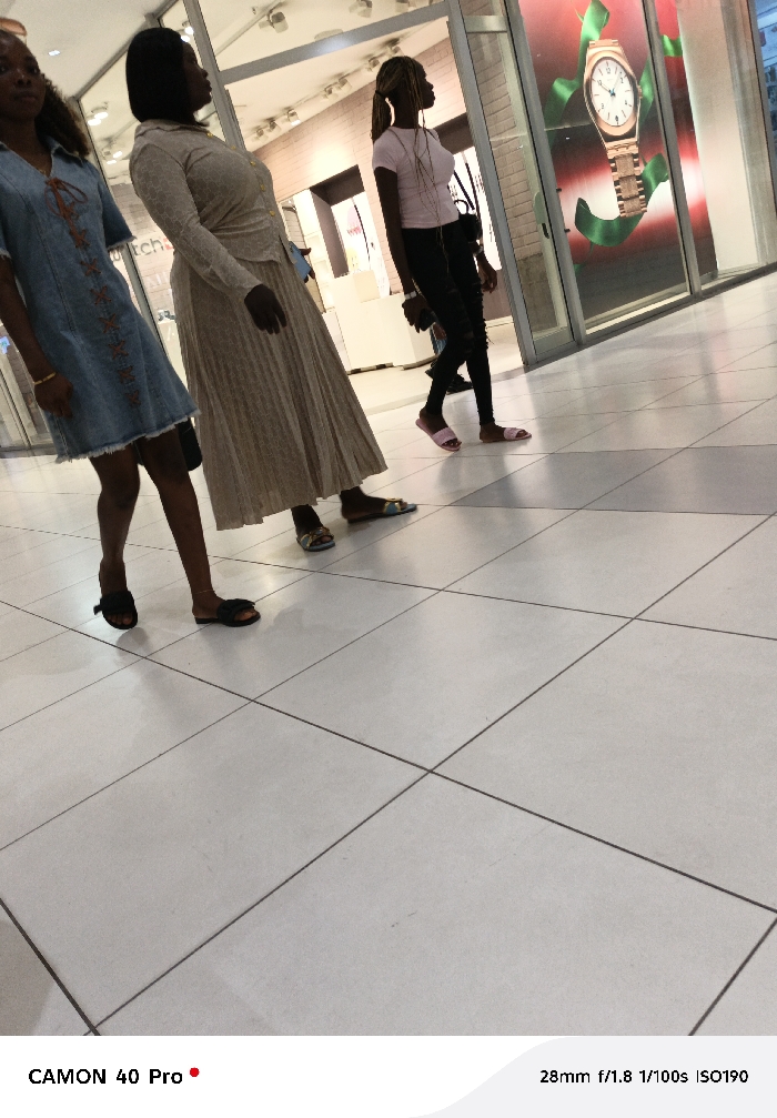 Three women are walking through a shopping mall. The woman on the left is wearing a denim dress and black sandals. The woman in the middle wears a long, pleated dress and flat sandals. The third woman has her hair pulled back and is wearing a pink t-shirt, black jeans, and pink sandals. A store window displaying a large watch is in the background. The mall floor is tiled in white.