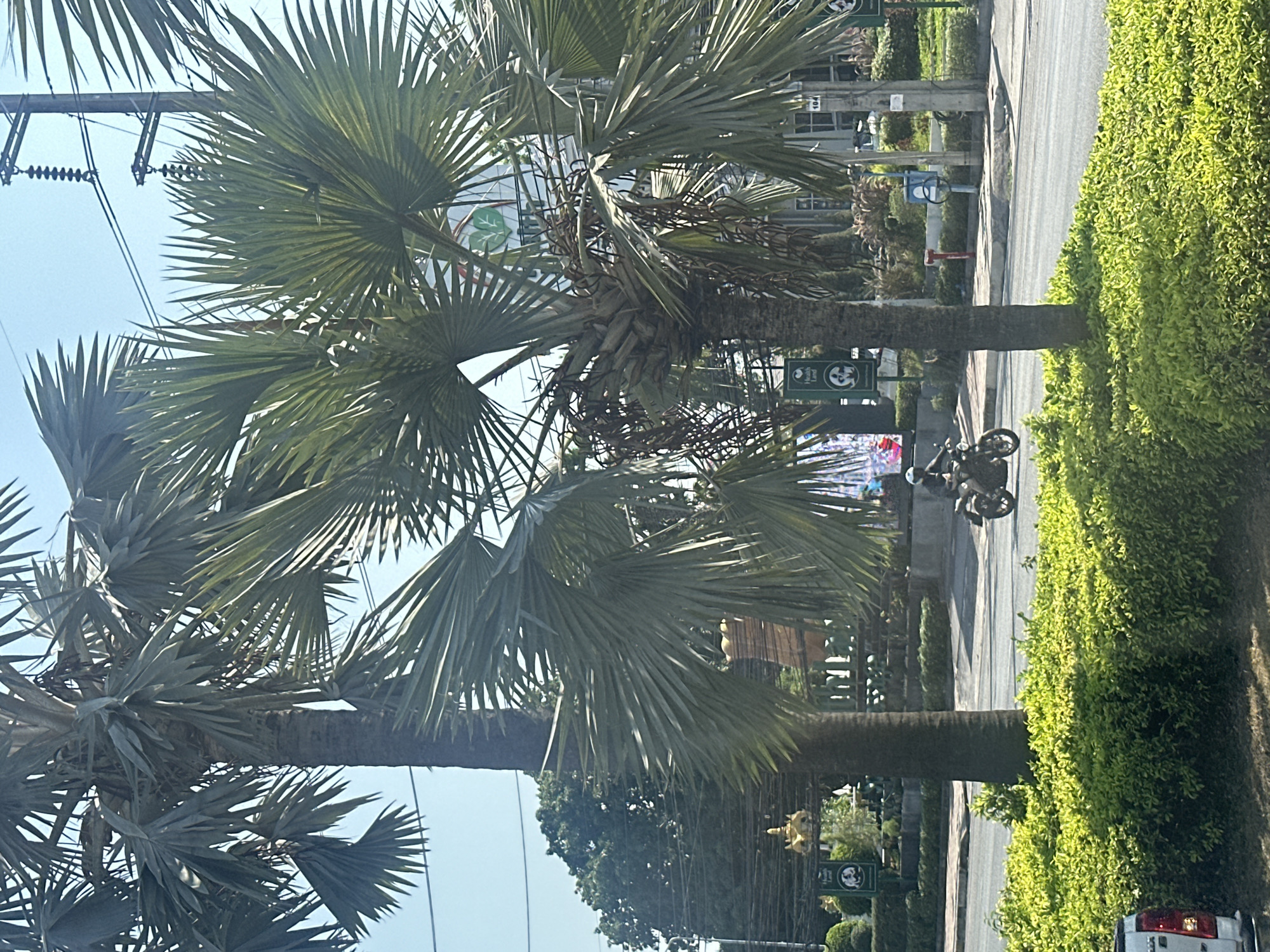 street scene in Pattaya City, Thailand, captured in daylight. Two mature palm trees dominate the left side of the frame, their broad, fan-shaped leaves obscuring parts of the background. Overhead power lines are visible against the clear blue sky. To the right, a road runs parallel to a thick hedge. A motorcycle with two riders is seen on the street. Various signs and buildings are located in the background, along with the partially visible sign of "Healthy Land". A white car with a visible red tail light is in the lower right corner of the frame.