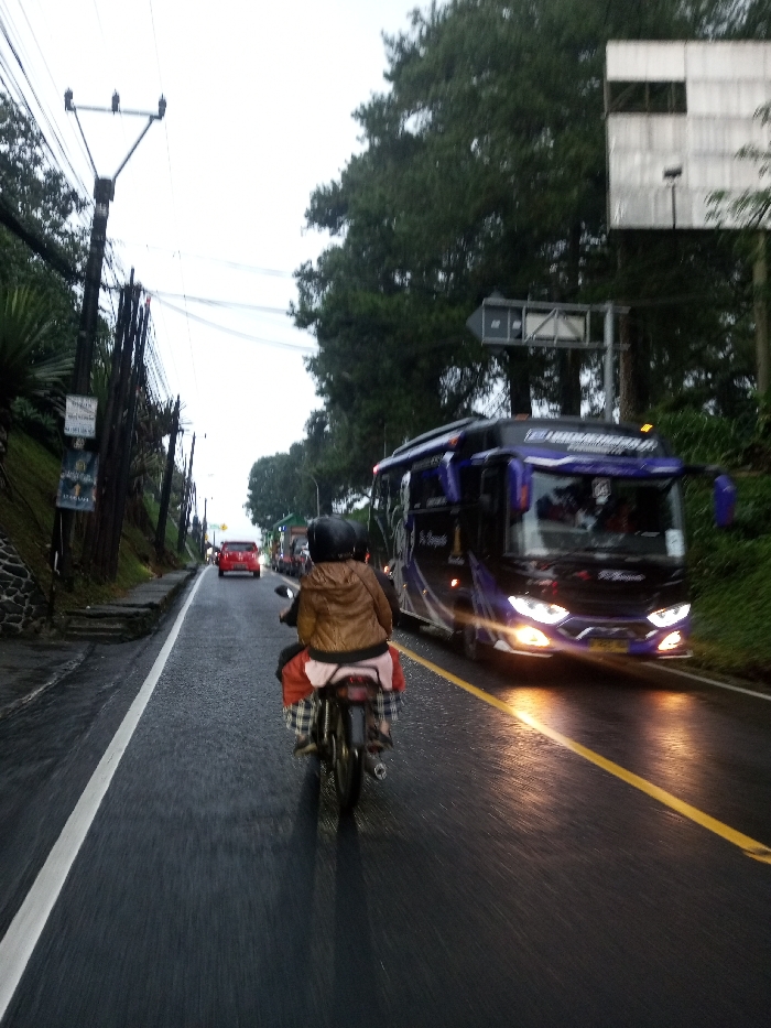 The scene is a public road in Dawathang_Dorjibi_ Kashingtsawa, Bhutan, under overcast conditions, likely late afternoon or early evening, indicated by activated vehicle headlights and reflective surfaces. The asphalt road, appearing wet, features a solid white line marking the left edge and a solid yellow line delineating the right side of the visible lane. In the immediate foreground, from a perspective behind it, a motorcycle travels away from the viewer. The operator wears a brown jacket and a dark helmet. Behind the operator, a second individual, likely a passenger, is partially visible, wearing a light-colored garment. An orange-colored object, consistent with luggage, is secured to the rear of the motorcycle. Approaching from the right lane, a large dark blue and purple passenger bus is prominently featured, its headlights illuminated and reflecting on the wet road. The bus has "S. PARWIS" visible on its side. Further down the road, a red car is discernible in the distance, also traveling in the same direction as the motorcycle. To the left, a sloped embankment covered with green foliage and some exposed rock features a stone retaining wall at its base. Utility poles with multiple electrical wires run parallel to the road. Several signs are attached to these poles, their text largely indecipherable. To the right, dense green trees line the roadside, partially obscuring a large, rectangular white billboard structure. A smaller overhead sign structure is also visible above the right lane.