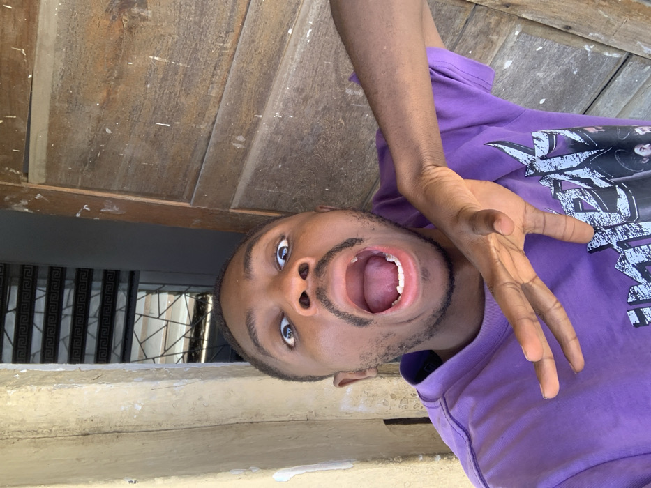 The image depicts a close-up, upward-angled selfie of a young adult male, presumably taken indoors within what is indicated as Barakin Lerawi, Nigeria