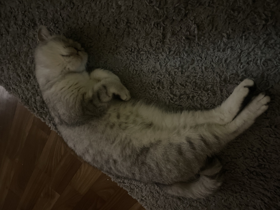 A silvery-gray cat rests on its back on a gray shag rug. Its head is turned to the side with eyes closed. Paws are curled near its chest. Its body stretches downward, legs splayed out at the end. The rug covers most of the scene, with a glimpse of wooden flooring visible at the lower left corner.