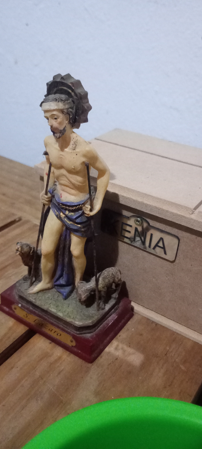 A statue of Saint Lazarus, depicted as a man with a beard, partial head covering, and wearing a blue and gold robe. He is holding two sticks for support, with a dog and a sheep at his feet on an elaborate base. "S. Lazaro" is inscribed on the base. The statue sits on a wooden surface, with a wooden box labeled "KENIA" behind it. A green object is partially visible in the lower part of the image.