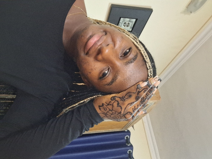 A woman with dark hair and blonde highlights is shown. She has her hand pressed against her face, displaying henna art. She has on a black shirt. In the background is a frame and blue curtains with silver rings are visible. The photograph has a neutral tone.