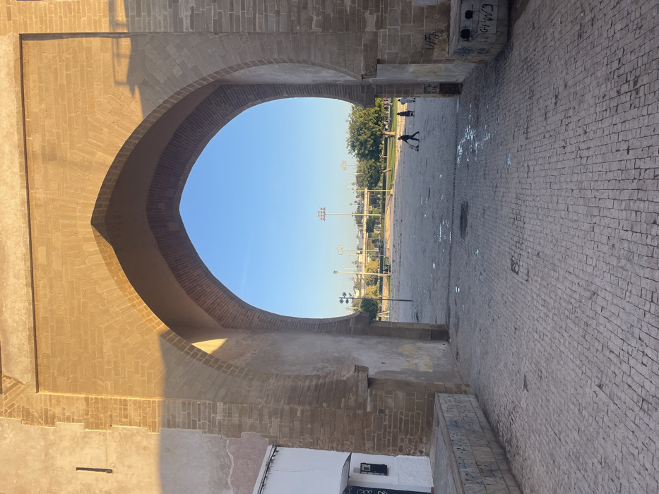 A tall, ornate archway frames a distant view of a sunlit plaza and blue sky. The archway is constructed of tan bricks, with a rounded top and prominent vertical details. Beyond, the plaza is paved with stone, featuring streetlights and trees. Figures are seen walking in the distance. Graffiti mars some surfaces of the archway.