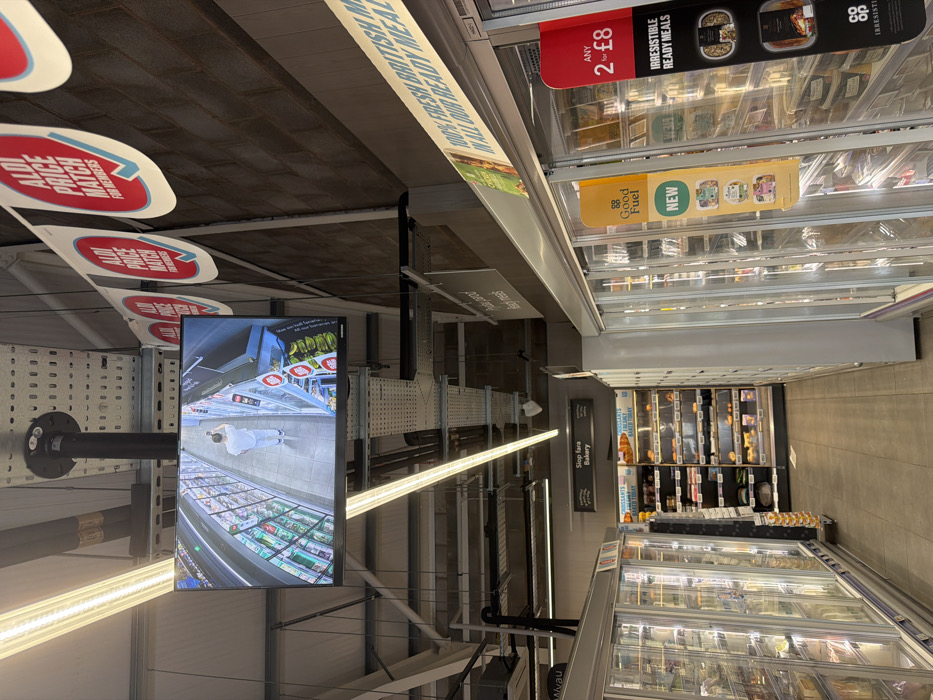 This image captures the interior of a Co-op supermarket located in Pentre, United Kingdom, specifically an aisle lined with refrigerated display units and leading to a bakery section. The perspective is from eye level, looking down the aisle towards the store's rear. Overhead, an exposed industrial-style ceiling is visible, featuring grey metal ducting, cable trays, and long, linear fluorescent light fixtures providing illumination. A black, flat-screen monitor is suspended from the ceiling by a black pole, displaying a live CCTV feed. The monitor's screen shows an overhead view of a male individual, dressed in a white t-shirt, white shorts, and white sneakers, walking away from the camera's perspective down a separate store aisle. He is holding a dark object, possibly a mobile phone, in his right hand, raised as if recording or taking a photograph. This depicted aisle features refrigerated display cases on the left and a produce section, including bananas, on the right. Along the right side of the main photographed aisle, multiple glass-fronted refrigerated units are present, stocked with various packaged food items. Above these units, a banner reads "100% FRESH BRITISH MEAT IN ALL OUR READY MEALS." Attached to the freezer doors are promotional signs, including a yellow and green "Co-op Good Fuel NEW" sign and a red and black "ANY 2 FOR £8 IRRESISTIBLE READY MEALS Co-op" sign. Higher up, near the ceiling, several red, white, and blue banners prominently display "ALDI PRICE MATCH FOR MEMBERS." On the left side of the main aisle, another row of similar glass-fronted refrigerated display units extends into the background. At the far end of the aisle, a "Siop fara Bakery" section is visible, featuring open shelves and glass cases filled with baked goods, including croissants. A sign in this area states "CROISSANTS FRESHLY BAKED TODAY." The floor is tiled in a light grey color. No individuals are directly present within the observable store environment beyond the person depicted on the security monitor.