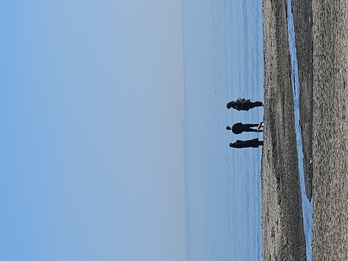 The image displays a coastal scene on a beach in Burgas, Bulgaria, under a clear, light blue sky. In the foreground, a sandy beach, characterized by areas of light and dark sand, is bisected by a shallow, narrow stream of water flowing towards the sea. Three adult individuals are positioned near the water's edge, their backs largely turned to the camera, observing the sea. The leftmost person wears a long, dark coat. The central individual wears dark clothing, and a small, light brown dog stands directly in front of them on the sand. The rightmost person wears dark attire and has a light-colored bag or backpack slung over their left shoulder. The sea is calm and blue. A faint, distant urban silhouette is visible on the horizon line above the water, indicating a populated area across the bay or along the coast.