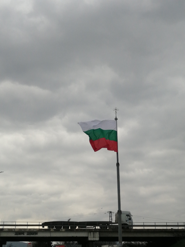 The image depicts an outdoor scene in Stara Zagora, Bulgaria, under an overcast sky. A Bulgarian national flag, displaying horizontal stripes of white, green, and red from top to bottom, is prominently featured, flying from a tall, grey flagpole. The flagpole is topped with a metal Orthodox Christian cross. In the mid-ground, a multi-lane concrete overpass or bridge spans horizontally across the frame. A white semi-truck is partially visible on the overpass, moving from left to right. Metal railings line the sides of the bridge. Utility poles and overhead power lines are visible in the distance behind the bridge on the right. Below the overpass, concrete support structures are visible, and the Cyrillic text "ДОБРЕ ДОШЛИ" (DOBRE DOSHLI - Welcome) is stenciled or spray-painted onto the underside of the bridge structure on the left. The sky is uniformly grey and heavily clouded, dominating the upper two-thirds of the image. No individuals are discernible.
