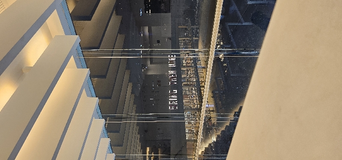 A message in illuminated block letters reads "BRING THEM HOME" across a dark interior. The scene is viewed through a transparent barrier, reflecting the architecture above: a structured ceiling with parallel white bars. A horizontal surface with a light-colored hue dominates the foreground, contrasting the darker reflection and the message behind the barrier. The image features sharp lines and symmetrical patterns, creating a modern and somewhat abstract composition.