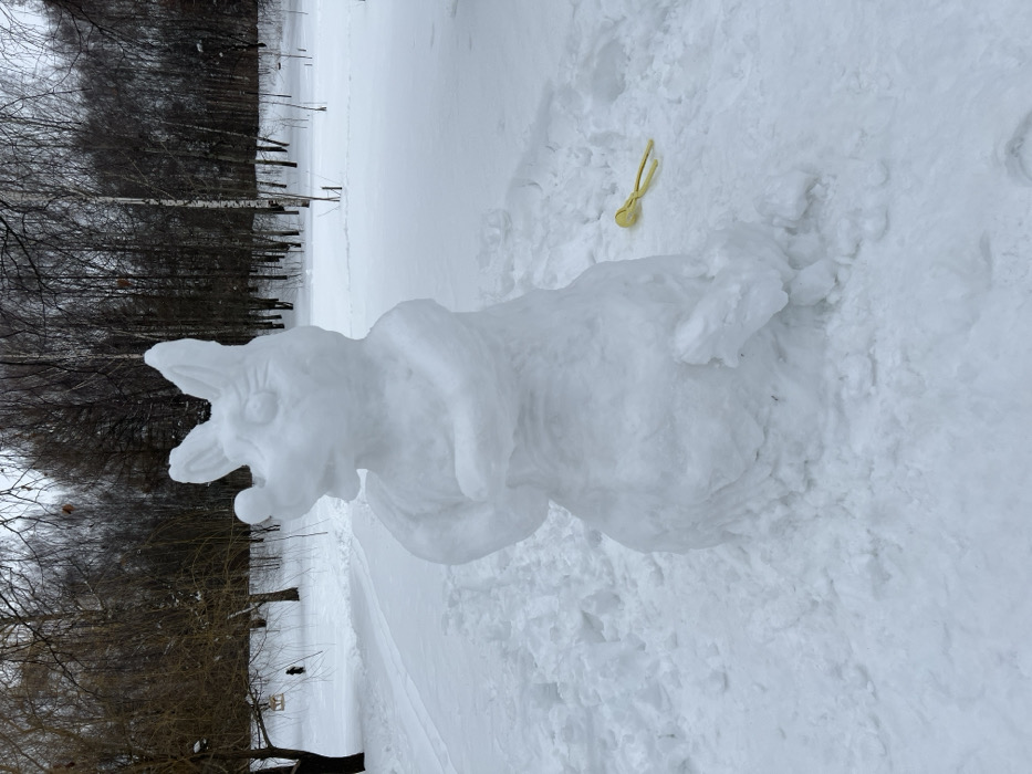 Rusanovo, Russia: The scene presents a snow-covered outdoor environment featuring a large, white snow sculpture as the central subject. The sculpture, approximately 1.5 meters in height, depicts an anthropomorphic bipedal animal with prominent pointed ears, a distinct snout with a rounded nose, circular eye indentations, and arms crossed over its chest. It stands on a field of white, undisturbed snow. To the immediate right of the sculpture's base, a yellow plastic snowball-making tool lies on the snow surface. A discernible snow path or ski track extends into the midground behind the sculpture. In the distant left background, a solitary, dark-clad figure is partially visible near a bare tree, and a bird feeder is suspended from a branch of another bare tree. The background is dominated by a dense, leafless forest of deciduous trees with dark trunks under an overcast, light grey sky. No explicit actions or interactions are observed.