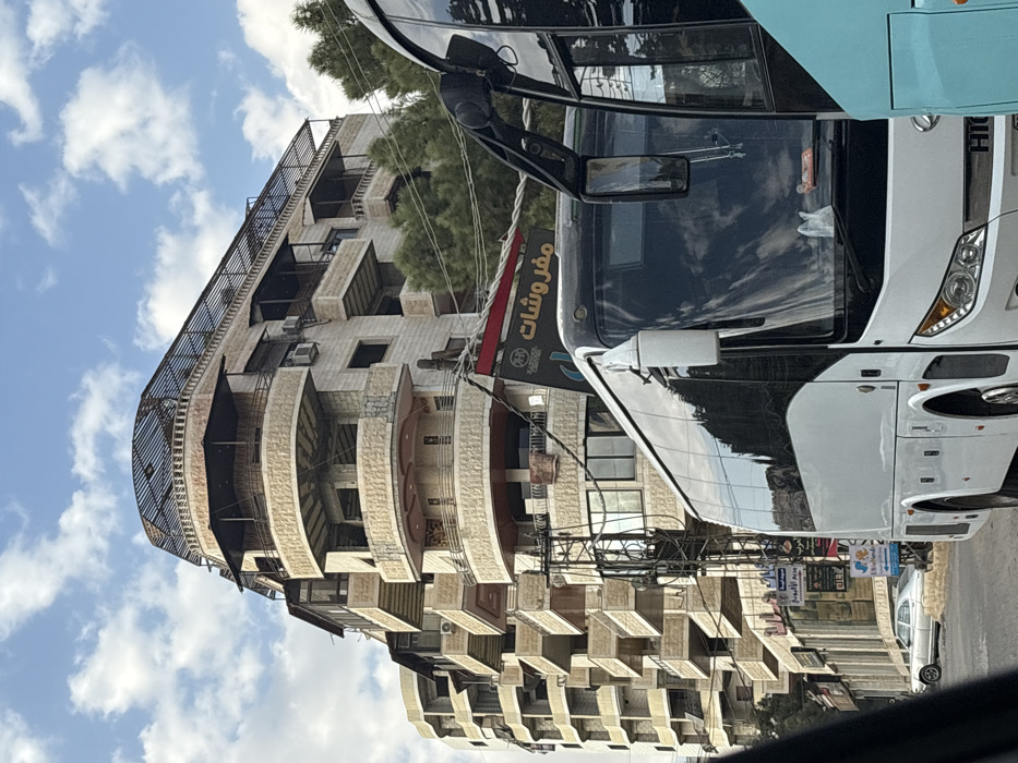 An outdoor, eye-level, slightly upward-angled photograph captures an urban street scene in Qudsaiya, Syria, under a partly cloudy sky. The primary subject is a multi-story building, constructed with light-colored stone, dominating the mid-ground and background. This building features numerous, stacked, curved balconies with dark railings and a distinctive curved, slatted structure on its rooftop. Several windows and external air conditioning units are visible on its facade. To the left, another similar building with layered, curved balconies is partially visible. In the foreground, two large passenger buses are parked or moving. A white and black coach bus occupies the lower-center and left, displaying a partially visible "HIC" logo on its front grille. Its windows reflect the sky and surrounding buildings. To its immediate right, only the front section of a light blue bus is visible. Between the buses and the main building, a large red and black sign with Arabic text "مفروشات" (furniture) is prominently displayed. Below this sign, utility cables and a pole are visible. Further down the street on the left, a white sedan is parked alongside a row of commercial establishments with various smaller signs. Green trees are visible behind the buildings in the background. No individuals are clearly identifiable. The overall environment suggests a moderately busy commercial and residential area.