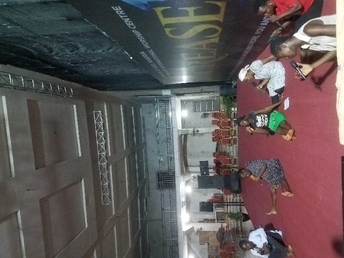 group of five young people sitting on a carpeted stage in an indoor venue. They are holding microphones and appear to be singing or performing. There is a large banner behind them on the right wall that says “House of God, Nigeria, International Worship Centre, Increase.” The venue has a concrete ceiling with many rectangular panels and a concrete floor with a tiled section at the back. The stage is lit by overhead fluorescent lights. There are rows of red plastic chairs stacked to the left. This location is near the intersection of Tombia Street and Aba Road in Port Harcourt, Nigeria.