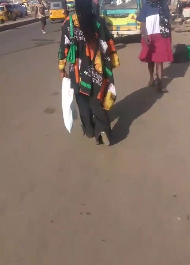 street scene in what appears to be an African country. Several people are walking along a paved road. In the foreground, a person with long braids and a colorful, patterned jacket is walking away from the camera, carrying a white plastic bag. To the right, another person in a hijab and a red skirt is walking. A yellow van is parked on the side of the road, with its back facing the camera. Several other people and vehicles, including a three-wheeled taxi, are visible in the background. The sky is clear and sunny.