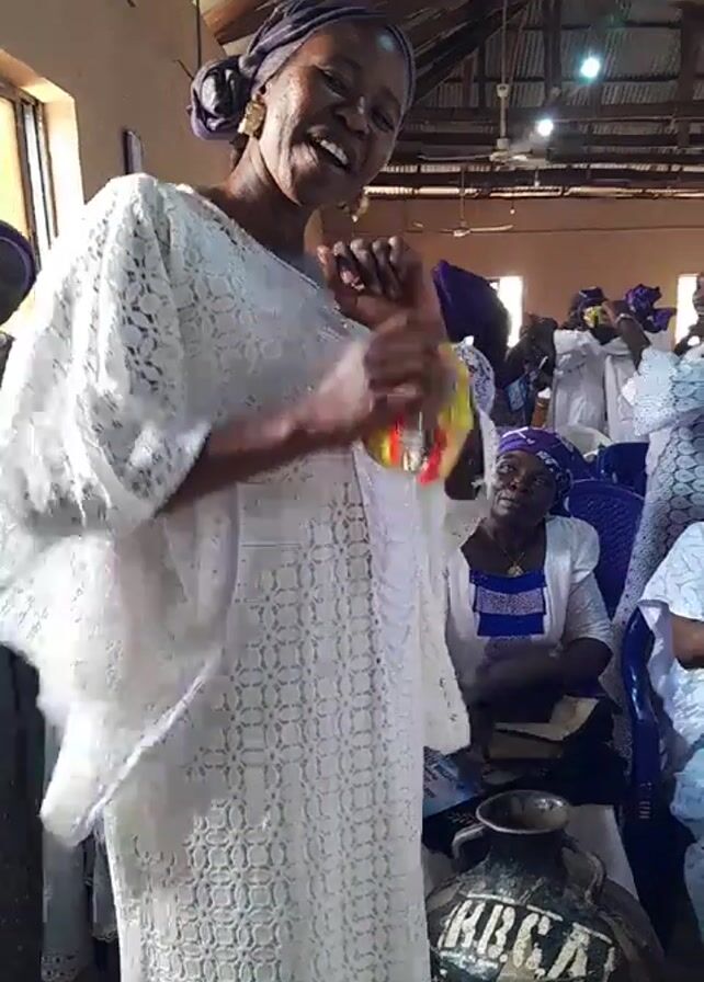 Inside a building with a high, exposed beam ceiling and ceiling fans, a middle-aged Black woman, wearing a white lace dress and a dark blue headwrap, dances while holding a yellow package. She turns slightly to her left. Other women in white dresses and blue headwraps are seated in the background. A large, black painted vase with white lettering stands near her. A red drum can be seen in the background to the right. Music plays loudly.