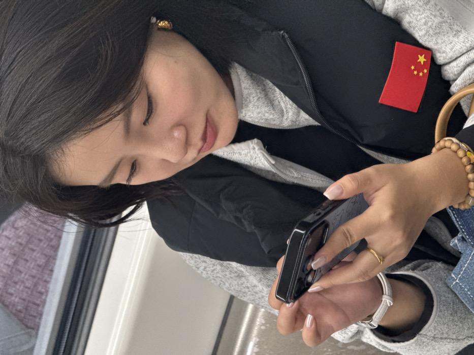 An adult female of East Asian ethnicity is depicted inside a subway train in Yuzhong District, China. She is seated or standing, looking downwards at a black smartphone held horizontally in both hands. The phone has a dark protective case. She wears a light grey zippered top, a black undershirt, and a black puffer vest. A rectangular patch displaying the national flag of the People's Republic of China is affixed to the right chest area of her vest. Her fingernails are manicured with a light tip. Accessories include a white-strapped watch on her left wrist, a plain gold-colored ring on her left ring finger, a beaded bracelet on her right wrist, and a gold-colored earring in her right ear. The train interior features light-colored, smooth panels and a darker window or blurred element in the upper background.
