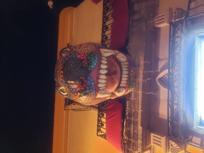 A large, colorful skull mask or decoration hangs from a building. The mask is intricately patterned with floral and geometric designs. It has a large open mouth displaying prominent teeth. A section of red fabric is draped above the mask, possibly part of the decoration. The building has ornate metalwork balconies and decorative window features. Strings of lights are also visible. The left portion of the image is dark.