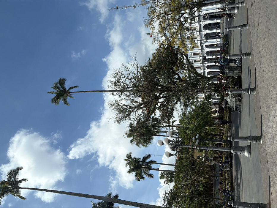 The image captures a sunny day in a plaza. Tall palm trees reach towards a bright blue sky filled with fluffy white clouds. In the background, a stately building with arched windows can be seen, adorned with a Mexican flag. The plaza is lined with ornate lampposts and shaded by large trees, with benches and people enjoying the atmosphere.