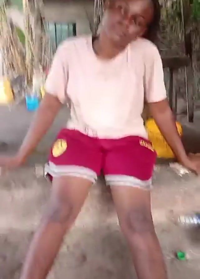 person sitting on a concrete step in an outdoor area. The person is wearing a light pink t-shirt and maroon shorts with white trim, and sandals. The person has dark skin and braided hair. They are leaning to the side with their head tilted, and their eyes are closed. Behind them, there are banana trees and a small building. There are also several yellow and blue containers scattered around. To the right, there is a small metal bowl, a water bottle, and another container on the concrete step. In the background, there appears to be someone working with metal. The camera moves slightly during the video.