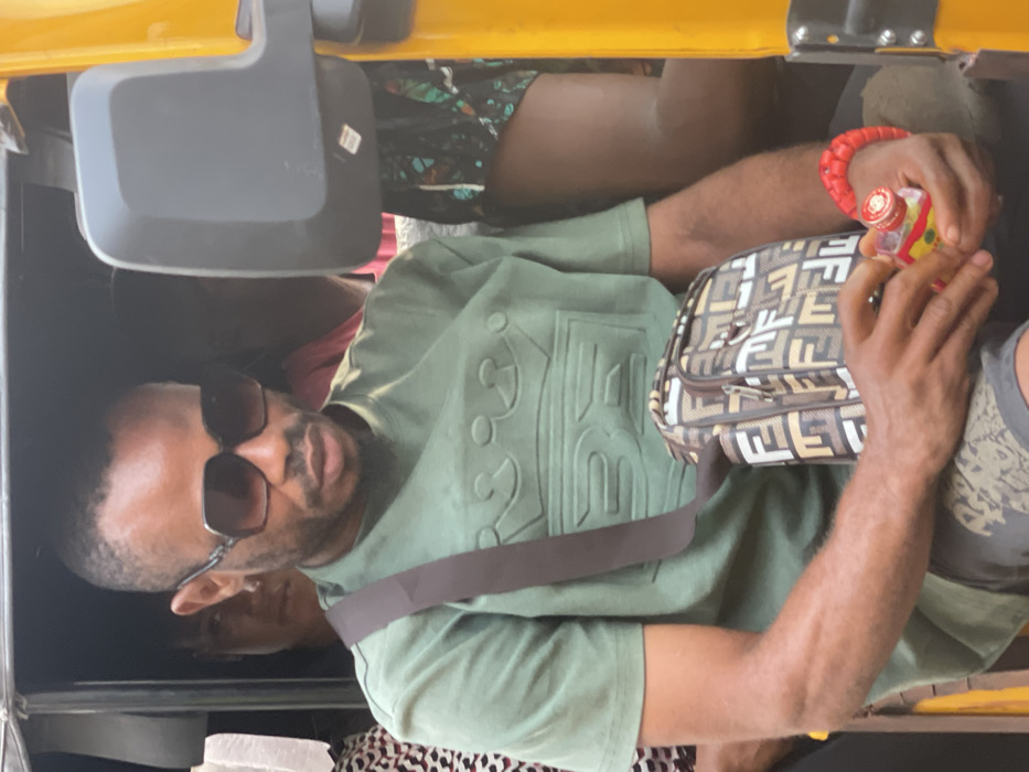 An adult male is seated within a yellow auto-rickshaw (keke napep) in Asaba, Nigeria